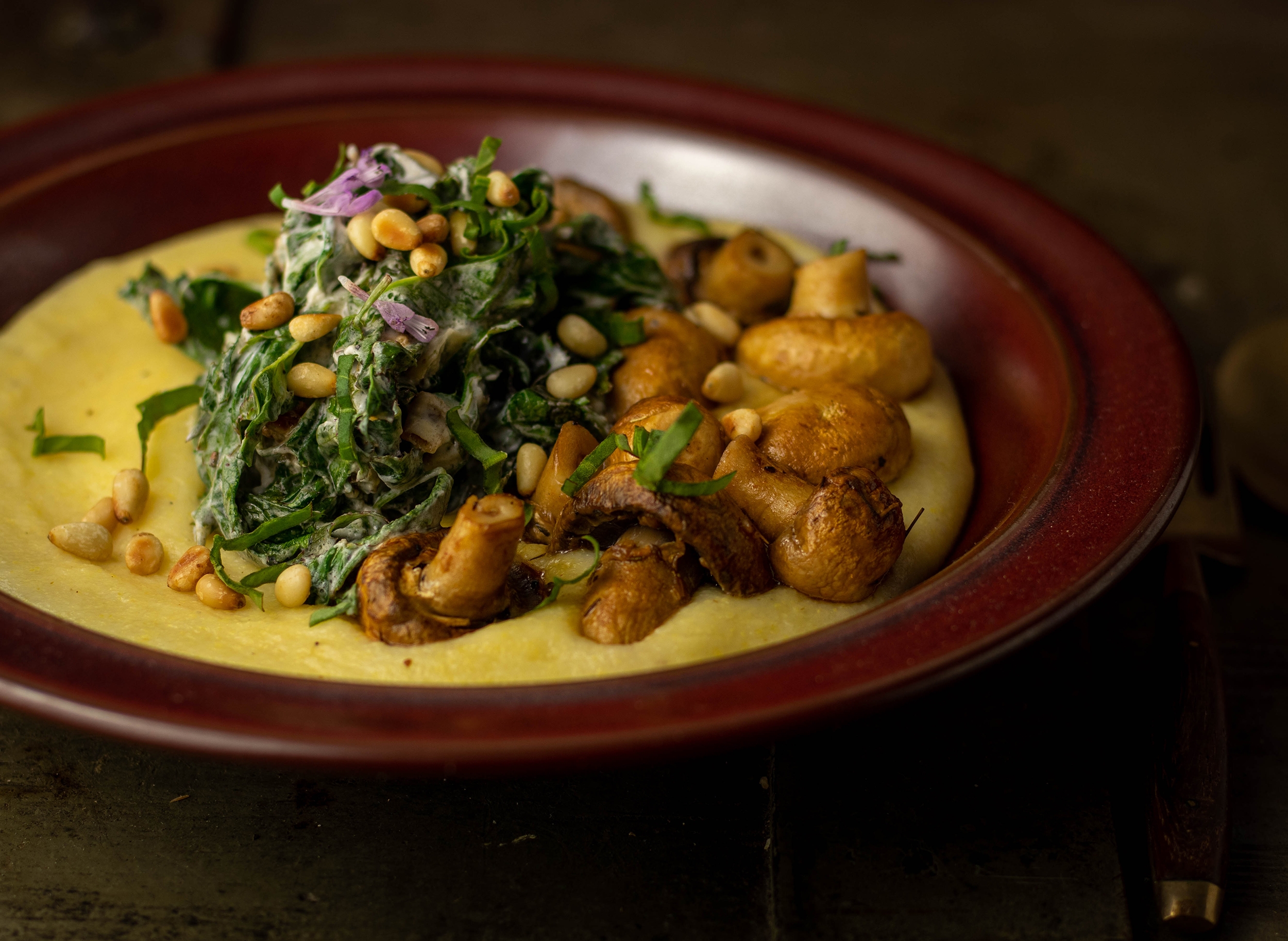 Ofenchampignons An Gedunstetem Giersch Auf Cremiger Polenta